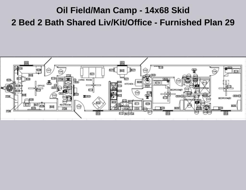 The demanding nature of the US oilfield industry necessitates innovative housing solutions for your workforce. At Buy A Man Camp, we understand the need for functional and comfortable living arrangements, especially in remote locations. That’s why we offer the Oilfield Mancamp, a spacious mobile unit measuring 14 feet by 68 feet and designed to comfortably house up to four residents. This skid-mounted unit features two separate bedrooms, each with an en-suite bathroom, along with a shared living area and a dedicated office space, providing a functional and private living environment for your crew.